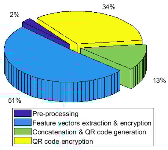 In this section, we test the execution time of our scheme that was implemented on a Raspberry Pi 4 model B board. This hardware board is equipped with 2 GB RAM and a 1.5 GHz quad-core CPU. To perform the experiments in the present runtime analysis, we used all 48 ECG recordings from the MIT-BIH arrhythmia database, which is largely used in medical research. The length of the frames used to generate the feature vectors and the size of the corresponding QR code are indicated in Table 5. Then, our scheme was executed on Raspberry Pi 4 model B for the ECG recordings using two execution modes: sequential and parallel execution. Our scheme was run 10 times, and the average execution time for the test recordings was computed and is reported in Table 4. From this table, we can notice that the parallel computing on Raspberry Pi significantly improved our scheme’s global execution time by an ETIR > 65% compared to the sequential execution. This improvement allows for saving important energy in the case of large databases due to the reduction in the Raspberry Pi board’s running time. Thus, our security scheme suggestion is cost-effective regarding energy consumption and can be efficiently deployed in the IoMTs and smart city projects.