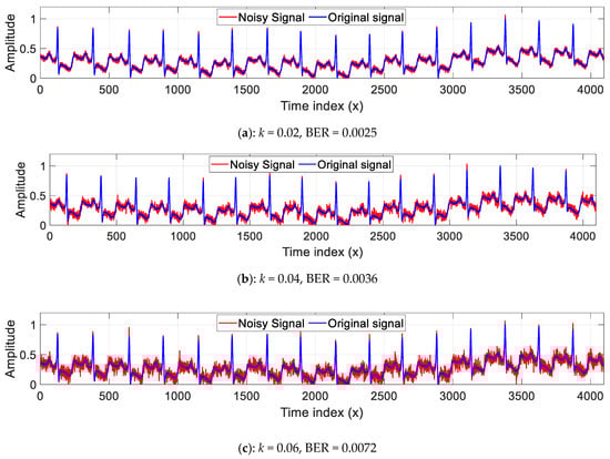 Original ECG signal and its amplitude scaled versions with the corresponding BER values.