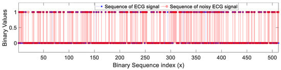 In general, watermarking schemes proceed in two phases: the first one is embedding secret binary information called watermarks in the original (host) signal. The second phase consists of extracting the embedded information from the host signal to confirm the originality of the copyrighted signal. However, the watermark insertion into bio-signals, especially ECGs, can lead to visual artifacts in this signal. Such artifacts can lead to misdiagnosis, and the corresponding treatment can have fatal consequences for the patient []. To avoid this problem, researchers are using zero-watermarking methods, which allow protection of the copyrights of bio-signals without introducing any modification of these signals. Indeed, Ali et al. [] proposed a zero-watermarking scheme to protect patient identifiers (IDs) and detected vocal cord disorders. Experimental results showed that Ali et al.’s scheme could successfully assure bio-signals’ imperceptibility and exhibited good reliability in ID extraction. However, since Ali et al.’s algorithm is based on a spatio-temporal descriptor, namely the local bit pattern (LBP), the robustness of this algorithm is weak in noisy environments. To address this problem, Daoui et al. proposed in [] a zero-watermarking scheme in the transform domain using the sine cosine algorithm (SCA) [] and Krawtchouk–Charlier fractional-order transform. The simulation results showed that the proposed scheme provides both imperceptibility of bio-signals and high robustness against different types of signal-processing attacks, including noise attacks. Daoui et al. recently proposed in [] a novel scheme for biomedical zero-watermarking using quaternion Shmaliy moments and short-time Fourier transform (STFT). This scheme could provide good robustness to different types of signal-processing attacks. Encryption schemes can also be implemented to provide a high degree of security when exchanging bio-signals via unsecured communication channels [,,,,].