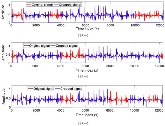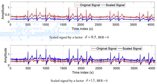 The multiplication of a constant value by the amplitude of a signal function enables generation of a scaled signal , while the values on the time axis remain unchanged. In this test, we examined the effectiveness of the proposed method in resisting scaling attacks of signal amplitude. For conducting the present test, an ECG signal called “Record_232” was used, which was distorted by scaling attacks of factors and . Then, the copyrights of the attacked signals were checked via our security scheme. The results of the actual test, presented in Figure 22, showed that the BER values were equal to zero. This indicates that our scheme can effectively resist the amplitude scaling attack. This finding is because, in the feature vector calculation stage, the signal amplitude must first be normalized between 0 and 1, which allows for avoidance of amplitude scaling attacks.