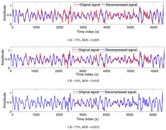Original MMG signal and its compressed versions with the corresponding BER values.