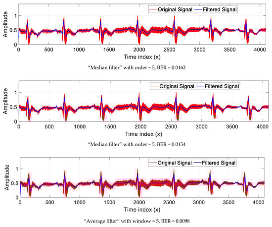 Because of the noise that can affect a signal during its transmission, the bio-signal can be filtered for noise removal before being used for diagnostic purposes. In this test, the robustness of the proposed scheme against signal filtering was checked. For this, a test signal named “118e06” of ECG type (Figure 20) was used. This signal was then filtered by the “Median filter” of orders 5 and 10. This record was also filtered by the “Average filter” with a window of size 10. Next, the BER value was calculated for each filtered signal. From the results displayed in Figure 20, we can observe that the BER values remained close to zero. This finding means that the ECG signal copyrights were validated even if this signal was filtered by various filters.