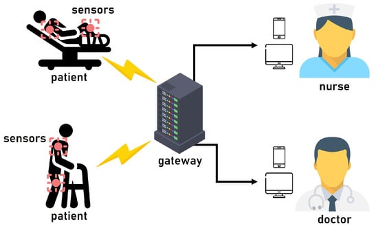 Recently, with the increasing number of elderly people in society, the demand for medical services is increasing, owing to the health problems of the aging society []. In addition, the emergence and spread of infectious diseases such as COVID-19 has accelerated this demand []. Therefore, solving the problem of meeting the supply and demand for healthcare has emerged as a challenge for governments in various countries. Many attempts have been made to use wireless sensor networks (WSNs) to address this problem. Because of sensor miniaturization and improved wireless communication technology, WSNs are widely used in various environments, such as the Industrial Internet of Things [], smart homes [], and healthcare []. A method was thus proposed that comprises a wireless body area network (WBAN) that incorporates WSNs into the medical field []. The WBAN framework includes medical professionals, gateways, and sensor nodes. Through a gateway, a medical professional receives information concerning a patient’s condition from sensors attached to the patient or elderly person’s body []. Medical services that use WBANs are more efficient for both medical professionals and patients. Using them, medical professionals can conveniently treat more patients than before, and patients can receive treatment regardless of location. This approach also limited the spread of infectious diseases by reducing contact between medical professionals and patients during the COVID-19 pandemic. Therefore, research on WBANs has been conducted continuously.