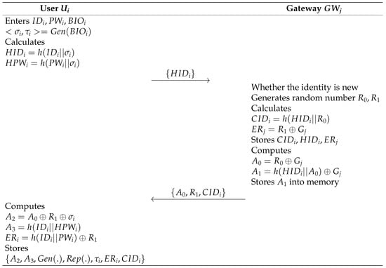 - The user enters her/his own , and imprints into the mobile device. Then, calculates , and sends , as a registration request to the gateway through a secure channel.