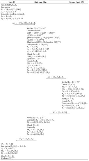 - selects the of the sensor to be accessed, generates a random number , and creates a timestamp . Then, calculates , , , and . Finally, sends message to via a public channel.