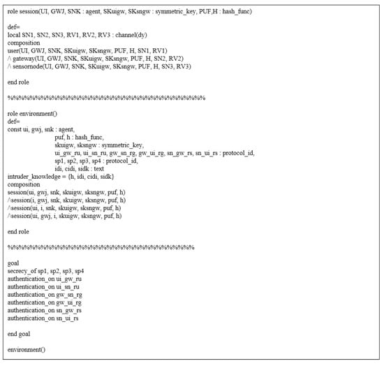 To analyze the security of the proposed scheme, we applied the widely used Dolev–Yao (DY) adversary model. Under the DY model, a malicious adversary can inject, eavesdrop, modify, or delete messages transmitted using public channels. We also adopted the Canetti and Krawczyk (CK) adversary model to analyze the proposed scheme. The CK model is relatively strong compared with the DY model and is widely used to analyze scheme security. In the CK model, the adversary can intercept a random value and generate the master key of a gateway: