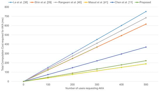 Total computation cost with increasing the AKA requests [,,,,].