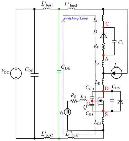 In a phase-leg configuration, such as boost, buck-boost, half-bridge, and full-bridge, the active switch makes current communication with the freewheeling diode during the turn-on and turn-off transition of the active switch. The basic cell is shown in Figure 1, with one branch being the output current, Io, one branch being the freewheeling diode, and one branch being the active switch, which was chosen to study. The input voltage source, VDC, is constant. The output current, Io, is constant. CDC is the DC bulk capacitor. CDE is the DC-side snubber capacitor. The switch, Q, is driven by the double pulse signal. The switching of Q causes current commutation with the external circuit and the diode, D. However, the parasitic elements existing in the circuit need to be considered due to the high-speed switching SiC MOSFET. The parasitic elements in Figure 1 are the gate–source capacitance (CGS), the gate–drain capacitance (CGD), the drain–source capacitance (CDS), the gate inductance (LG), the drain inductance (LD), the source inductance (LS) of the Q and the junction capacitance (CF), the cathode inductance (LC1), and the anode inductance (LA1) of the diode (D). A SiC diode is employed as the freewheeling diode, which does not have the reverse recovery charge (Qrr) and has a low voltage drop. L′bus1, L′bus2, L′′bus1, and L′′bus2 represent the interconnection parasitic inductors of the PCB traces. LCS are the common source inductances shared by the switching power loop and the gate drive loop. RG represents the external gate drive resistance. vP is the gate signal for the SiC MOSFET.