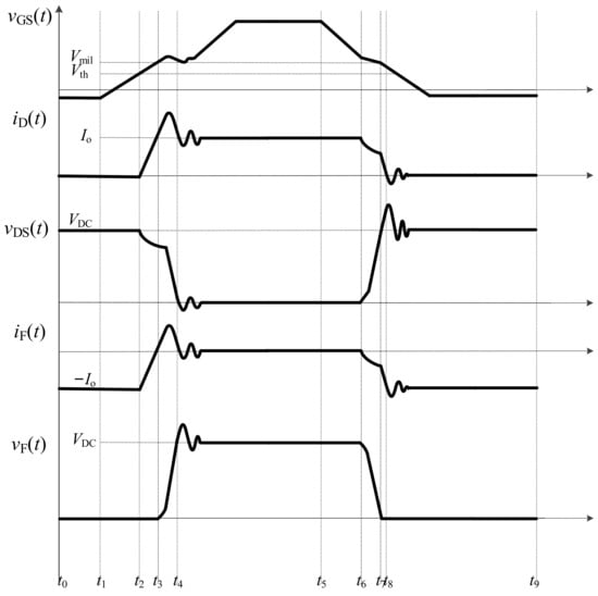 The turn-on switching transition of the SiC MOSFET can be divided into four stages [26], which are the Turn-on Delay Time (Stage 1: t1–t2), Current Rising Time (Stage 2: t2–t3), Voltage Falling Time (Stage 3: t3–t4), and Gate Remaining Charging Time (Stage 4: t4–t5). The turn-off switching transition of the SiC MOSFET can be divided into four stages [26], which are the Turn-off Delay Time (Stage 5: t5–t6), Voltage Rising Time (Stage 6: t6–t7), Current Falling Time (Stage 7: t7–t8), and Gate Remaining Discharging Time (Stage 8: t8–t9). Figure 2 shows the switching waveforms of the SiC diode and the SiC MOSFET. During Stage 4, the turn-off overvoltage and oscillation of the SiC diode occur. During Stage 7 and Stage 8, the turn-off overvoltage and oscillation of the SiC MOSFET occur.