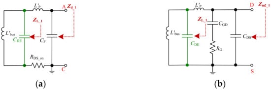 According to Figure 7, the terminal impedances, Zd_2 and Zm2_2, of the SiC diode and SiC MOSFET can be calculated as Equations (25) and (26),