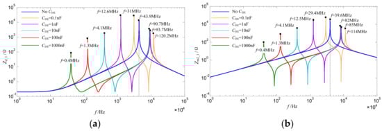 where Nd_1(s) and Dd_1(s) are shown in Appendix A. The amplitude–frequency curves of the terminal impedance Zd_1 are shown in Figure 4a, based on the parameters in Table 1. To be consistent with the experimental verification in Section 4, parameters of the SiC MOSFET C2M0080120D and the SiC diode C4D20120A were used. Based on Figure 4a, there are two resonant peaks existing on the terminal impedance Zd_1. The resonant frequencies are expressed as Equations (2) and (3),