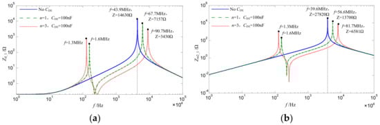 Figure 5 presents the amplitude–frequency curves of terminal impedances, Zd_1 and Zm2_1, with different n values based on parameters in Table 1. Inductors L′bus and L′P are set to 50 nH, 150 nH or 100 nH, 100 nH, respectively, which means n = 3 or n = 1. Based on Figure 5, the larger n is, the smaller L′P is, which represents that the capacitor CDE is closer to the devices, the lower the peak impedance is. Compared to without CDE, the peak impedance of terminal impedances, Zd_1 and Zm2_1, with CDE is reduced nearly n/(n + 1) times.