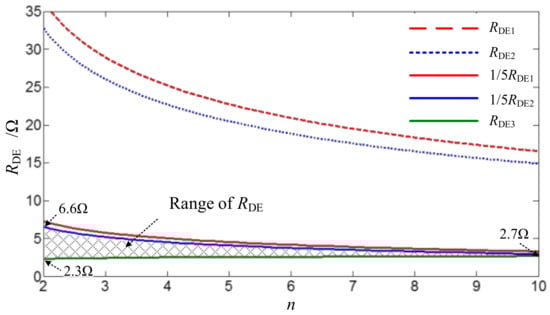 where RDE3 = 2(n/(n + 1))1/2((L′bus + L′P)/CDE)1/2. According to Equations (23) and (24), Figure 7 shows the range of the damping resistor RDE. The larger n is, the smaller the range of the damping resistor RDE is.