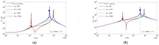 where Nm2_1(s) and Dm2_1(s) are shown in Appendix A. The amplitude–frequency curves of the terminal impedance, Zm2_1, are based on the parameters in Table 1, as shown in Figure 4b. In Figure 4b, there are two resonant peaks existing on the terminal impedance Zm2_1, which is the same as the terminal impedance Zd_1. The resonant frequencies are expressed as Equations (2) and (3),