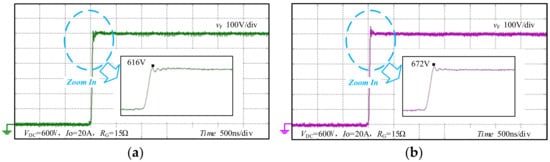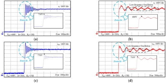 Figure 10 shows the experimental waveforms without and with capacitor CDE, in which capacitor CDE is the multilayer ceramic capacitor and CDE = 100 nF. In Figure 10a,b, the turn-off voltage of the SiC diode is presented. In Figure 10c,d, the turn-off voltage of the SiC MOSFET is presented. Compared to results in Figure 10a,c, without capacitor CDE, the turn-off overvoltage of the SiC diode and SiC MOSFET reduces obviously in Figure 10b,d. However, it is shown that the low-frequency oscillation overlays the high-frequency oscillation on the turn-off voltage of the SiC diode and SiC MOSFET.