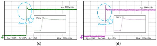 Tested waveforms without and with capacitor CDE. (a) Turn-off voltage of the SiC diode without CDE, (b) turn-off voltage of the SiC diode with CDE = 100 nF, (c) turn-off voltage of the SiC MOSFET without CDE, and (d) turn-off voltage of the SiC MOSFET with CDE = 100 nF.