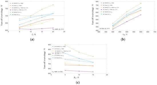 Turn-off overvoltage of the SiC diode and the SiC MOSFET with DC-side snubbers (a) at different Io, (b) at different VDC, and (c) at different RG.