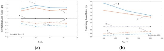 Switching losses of the SiC MOSFET with DC-side snubbers (a) at different Io and (b) at different VDC. (Note: 0: turn-on loss or turn-off loss with no CDE, 1: turn-on loss with CDE = 100 nF, 2: turn-on loss with CDE = 100 nF and RDE = 2.5 Ω, 4: turn-off loss with CDE = 100 nF, 5: turn-off loss with CDE = 100 nF and RDE = 2.5 Ω).