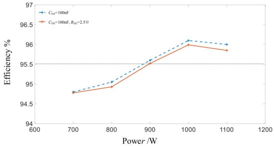 Figure 12 presents the turn-off overvoltage of the SiC diode and the SiC MOSFET at different Io, VDC, and RG. From Figure 12, although the higher Io, higher VDC, and lower RG make the turn-off overvoltage higher, DC-side snubbers have effective suppression on the turn-off overvoltage of the SiC diode and SiC MOSFET. Moreover, the DC-side snubber with the damping resistor CDE-RDE is the most effective. Figure 13 presents the effect of DC-side snubbers on the switching losses of the SiC MOSFET at different Io and VDC. Figure 13 employs the switching losses of the SiC MOSFET without the snubber as a reference quantity and transforms the switching losses with DC-side snubbers into per-unit. The turn-on loss of the SiC MOSFET with DC-side snubbers increases, and the turn-off loss of the SiC MOSFET decrease, because a portion of parasitic inductors is decoupled from the power switching loop. Figure 14 presents the efficiency of a 1.1kW buck converter with DC-side snubbers. The tested conditions of the buck converter are presented in Table 3, and the efficiency is tested under open-loop control. From Figure 14, it is observed that the efficiency of the buck converter with CDE = 100 nF, RDE = 2.5 Ω is a little lower than with CDE = 100 nF, which is owning to the loss of RDE.