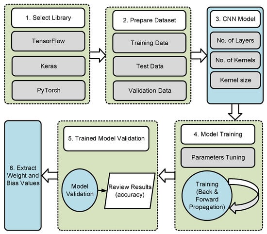 The detailed procedure is shown in Figure 3. The implementation of the CNN model starts with the selection of built-in frameworks. Different frameworks provide different data handling, mathematical, and graphical libraries, which are publicly available under different licenses. For example, NumPy is the best for dataset handling, whereas Matplotlib deals with plotting verities of graphs. For deep learning, there are three main frameworks: Keras, PyTorch and PyCharm. This study was conducted on Keras and TensorFlow at the backend. Once the right frame is selected, the dataset is prepared. Dozens of well-prepared open-source datasets are available, which are good for testing purposes. Classified data, must be prepared for the CNN. Data are not always well managed, and the accuracy of any CNN model is highly dependent on the dataset. It is also important to have a sufficient number of samples. A dataset that is too small, may result in over-fitting or under-fitting of the model. Generally, a data set is split into two parts in a ratio of 80/20, where 80% of the data are used for training and 20% are saved for testing and validation.