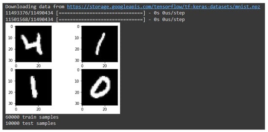 The MNIST/CIFAR10 and other open datasets are available for learning. In this study, we used the MNIST dataset. Once the dataset is successfully loaded, 4 random samples are printed for confirmation purposes shown in Figure 4.