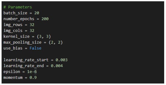 The definition of the CNN architecture contains comprehensive details of the parameters and hyper-parameters. Information on the number of convolutional layers, fully connected layers, number of kernels, kernel size, pooling type, pooling size, stride window, activation function, number of epochs, batch size, learning rate, and use of bias information is provided. The selection of parameters is shown in Figure 6.