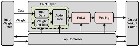 Our aim is to present a power-efficient design implementation technique that does not compromise the CNN structure and accuracy. The CNN engine is the most frequently used system for all applications, and thus consumes more power. The top CNN engine is shown in Figure 9, where the power consumption is reduced by reusing the memory, which occupies a major portion of the CNN engine. We applied the memory re-use technique, in which the input feature buffer memory was re-used for storing the updated weights values after each iteration.