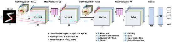 The convolutional layer is used to identify the primary features in the image by convolving with a set of learnable filters. Convolution is a linear and simple multiplication operation of a single or multi-dimensional array vector called filters with an input array. The filter’s dimensions are significantly small (3 × 3, 5 × 5, or 7 × 7) as compared to the input data dimension. Each filter is convolved horizontally and vertically in a sliding window fashion with input data resulting in an array of feature maps. The number of features maps is equal to the number of convolved filters. The detailed CNN architecture is shown in Figure 10. The element-wise multiplication and summation operations are given in Equation (1).