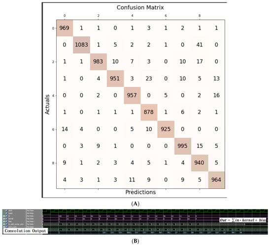A customized controller-based GUI was developed for testing, as shown in Figure 12. It was used to load the pre-trained weight and bias values files, and input data for testing. This GUI has many other control options, such as enable, reset, read, and write. Using this GUI, we can verify the output after each convolutional layer. To read and write, the files must be saved within a particular system path, where they can load to read or save to write. It reads the test simple pixel value in vector form, and weights values in hexadecimal. The final output class field is marked as the ANIC Class, which shows the final output class after the test. The tensor flow modeling results are shown in Figure 13a, in which we achieved the precision score of approximately 96. The proposed CNN engine design procedure was verified at the RTL level as shown in Figure 13b,c. It correctly classified the data as classified in the GUI.