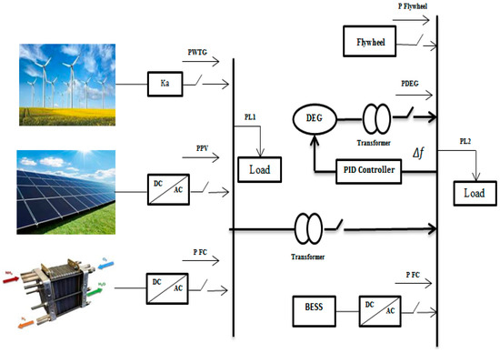 - Alayi, R.; Zishan, F.; Seyednouri, S.R.; Kumar, R.; Ahmadi, M.H.; Sharifpur, M. Optimal Load Frequency Control of Island Microgrids via a PID Controller in the Presence of Wind Turbine and PV. Sustainability 2021, 13, 10728. [Google Scholar] [CrossRef]