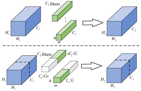 Meantime, with the same convolution operation, GC requires fewer parameters than ordinary convolution to avoid overfit []. The difference between ordinary convolution (upper part) and GC (lower part) is as shown in Figure 1, which means the model parameters will decrease as the number of filter groups increases.