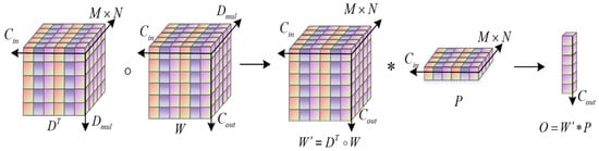 Li et al. proposed DO-Conv to speed up the convergence of the model, while adding learnable parameters to the model without increasing the computational complexity []. DO-Conv is a combination of an ordinary convolution and a deep convolution . Figure 2 shows the flowchart of DO-Conv. P is the size of the input feature map. and are the spatial dimensions of , is the number of input feature maps, is the number of deep convolutions, is the number of output feature maps, is the transposition of , and is the convolution kernel of. First, combine the deep convolution kernel and conventional convolution kernel to form , and then output by convolution of and , as shown in Formula (5).