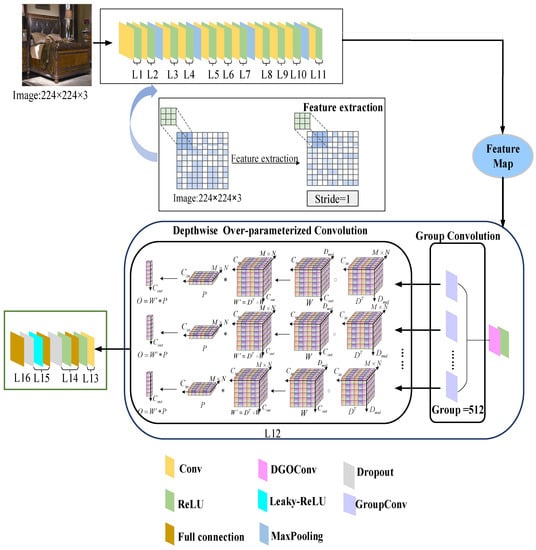 The improved VGG16 based on depthwise group over-parameterized convolution (DGOVGG16) model for furniture classification is shown in Figure 3.