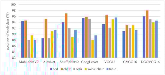 It can be seen from Table 4 that in the furniture dataset classification experiment of DGOVGG16, AA reached 95.51% at the highest, and increased by 3.45%, 0.98%, 2.72%, 2.85%, 4.57% and 4.59% respectively compared with GVGG16, VGG16, GoogLeNet, ShuffleNetv2, AlexNet and MobileNetV2. AlexNet model is the classification method with the shortest running time. It can be found that the running time of DGOVGG16 is 72 s longer than that of AlexNet, but the accuracy is increased by 4.57%, thus a slight increase in time is acceptable. Figure 6 and Figure 7 show the classification results of different methods and each category on the furniture dataset respectively.