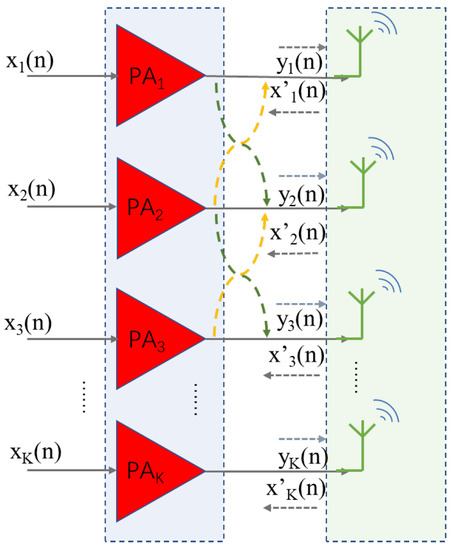 The 5G communication system has a higher degree of integration, and there may be hundreds of antennas used for transmission and reception. Figure 1 and Figure 2 simply represent a traditional MIMO transmitter and a mMIMO transmitter. The paper [7] emphasizes the importance of the crosstalk occurring after PAs and designs elaborate experiments. In [7], the two-input model is proposed based on ignoring the crosstalk that occurs before PAs. Then, the experimental verification of a four-element transmitter is carried out. It can be seen that the output of a branch is only related to the two input signals of this branch PA. Therefore, even if the number of data links increases significantly, the complexity of the system model is linearly related to the number of input links. The crossover digital predistorter (CO-DPD) in [4] is a DPD scheme applied in MIMO transmitters in the early stage, and its predistorter is based on Volterra polynomials. The decomposed vector rotation (DVR) model [8] makes us more abundant in the choice of behavior models for the PA modeling. In addition, model itself has its own characteristics. Compared with the traditional Volterra model and its simplified forms, the DVR model uses absolute value operations instead of high-order power to characterize the nonlinearity of PAs. The idea of segmentation is also reflected in the DVR model.