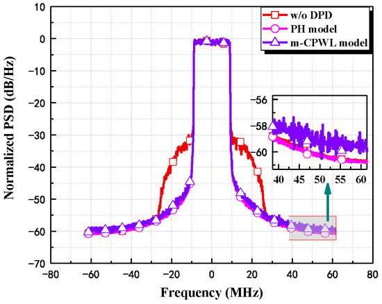 In this section, we verify the feasibility of the algorithm through the simulation analysis. To briefly illustrate our model, we performed a simulation test on one branch and used the PH model with K = 5, M = 2 and the m-CPWL model with K = 5, M = 2 to model the 2 × 2 MIMO transmitter. The signal xi,inject was obtained after three iterations. The SISO DPD uses the MP model [17] with K = 7, M = 3, and spectrum characteristics are analyzed. The normalized spectrum curve is shown in Figure 4, and the MP model can be written as the following: