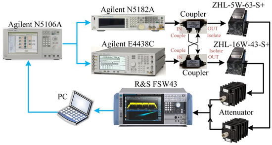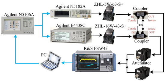 Figure 5 shows the block diagram of the platform setup when nonlinear crosstalk is introduced, and the block diagram of the experimental platform when linear crosstalk is introduced is shown in Figure 6. Agilent MXG N5182A generated a 20 MHz OFDM signal with a PAPR of 7 dB as the test signal in branch 1. Agilent MXG E4438C generated a 20 MHz OFDM signal with a PAPR of 7 dB as the test signal in branch 2. Each OFDM signal had 180,000 data samples with a sampling rate of 122.88 MHz. Two channel signals used in the test were uncorrelated. The coupling factor was set to −20 dB in our experiments. In the experiment of nonlinear crosstalk, we set couplers [18] at PA input. For the experiment of linear crosstalk, we set couplers at the output end of PAs. The PA models used in each branch were ZHL-5W-63-S+ and ZHL-16W-43-S+. The PA output signal was fed into a 40 dB attenuator, and the R&S FSW43 Signal and Spectrum Analyzer was used to receive and sample the output with a sampling rate of 122.88 MHz. The sampled output was then sent back to the personal PC for processing. For different predistortion models, experimental verification was performed by setting different order K and memory depth M. In case 1, we set K = 5, M = 2, and we set K = 7, M = 3 in case 2. The nonlinear crosstalk was introduced in the above two cases. In case 3, linear crosstalk was introduced, and we set K = 5, M = 2. The output power of branch 1 and branch 2 were set to 31.0 dBm and 35.3 dBm in all cases. ACPR and NMSE indicators were used to evaluate the performance of different DPD methods. ACPR is a metric of out-of-band linearization performance. It is the ratio between the power of adjacent channels (left or right or the average of both) and the power of the main channel in the frequency domain [19]. It is expressed as the following: