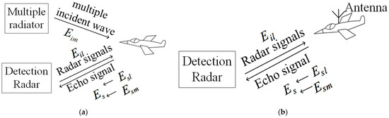 When the conductor is irradiated by multiple incident waves or equipped with active equipment, the surface current of the conductor changes dramatically [20]. This change leads to the variation of electromagnetic scattering characteristics of the conductor. In this case, the traditional definition is no longer applicable. As shown in Figure 1a, the target is illuminated by radar signals and multiple incident waves. It can be observed from Figure 1b that the target is radiated by radar signals and the antenna. The echo signals are generated by the combined effect of radar, multiple radiators and antennas. In this circumstance, the field energy distribution can be named as ARCS.