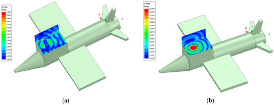Figure 4. (a) Electromagnetic field around the antenna system before the echo cancellation; (b) Electromagnetic field around the antenna system after the echo cancellation.