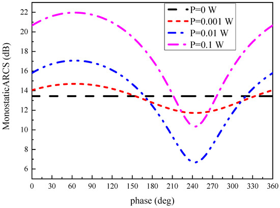 The head-on direction of the aircraft is chosen as the incident direction of the radar signal in the simulations, and the effect of phase change on the echo cancellation is studied first. The simulations were conducted in four cases with transmitting antenna feed power of 0.001 W, 0.01 W, 0.1 W and 0 W respectively, while the feed power of the auxiliary antenna is set to 0 W. The phase of the transmitting antenna was set to variable, ranging from 0° to 360° with an interval of 5°. By calculating the phase characteristics of the electromagnetic field, the active echo cancellation results are obtained for these four incidence cases with different power and phase characteristics. The simulation results are shown in Figure 5.