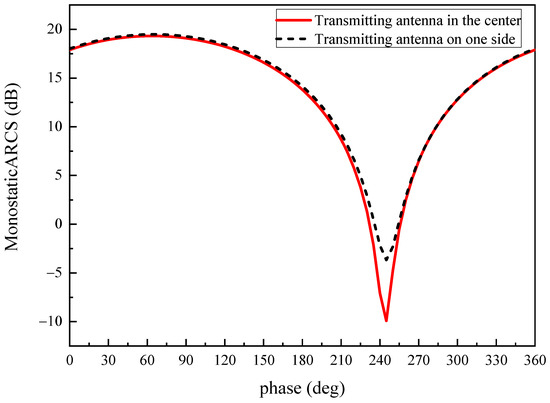The effect of antenna position on the echo cancellation effect is then discussed. The two antennas are placed symmetrically on both sides of the target, and the amplitude and phase of the transmitted signals from the echo cancellation antenna are adjusted to find the state that minimizes its ARCS. The echo cancellation antenna is then placed in the center of the target, and the other antenna is placed on one side, as in Figure 6, and we find the state with the minimum ARCS as well. The variation of the ARCS of the target with the phase of the echo cancellation signal in the two cases is shown in Figure 7.