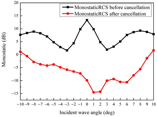 As can be seen in Figure 8, the ARCS of the target is effectively reduced in all the given directions. The ARCS is reduced by more than 6 dB in each of these directions, with a maximum reduction of 24.36 dB in the head-on direction. As long as the amplitude, phase of the incident wave and incident wave direction of the radar antenna are clarified by the dual-antenna receiving structure, the amplitude and phase of the electromagnetic wave that the target needs to transmit to reduce the ARCS can be obtained, the ARCS reduction can be achieved quickly and accurately according to the situation.