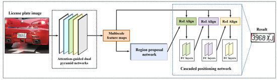 The framework of our proposed method is based on Mask R-CNN. Mask R-CNN employs ResNet [15] and FPN [16] as the backbone to extract features. Similarly, as illustrated in Figure 1, our proposed method consists of three main parts: attention-guided dual feature pyramid networks (ADFPN) for the feature extraction, a region proposal network (RPN) for candidate regions generation and a cascaded positioning network (CPN) for final license plate detection.