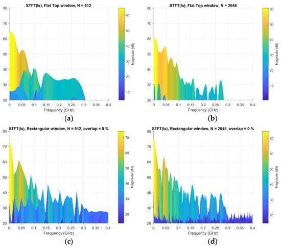 As [39,40,41] point out, this is a problem in the analysis of nonstationary signals. This is the case in our study, where impulsive and oscillatory components are added to the base spectrum of the switching signals of transistors. The literature discusses the use of other techniques to overcome this drawback. Two of the main techniques are the use of STFT and wavelets.