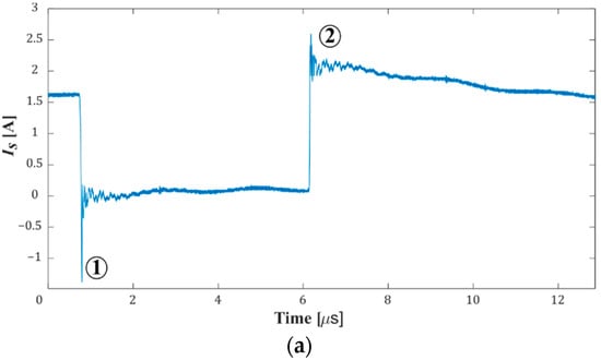 On this basic shape several authors try to add to the basic or simplified temporal waveform the effects of resonances caused by the excitation of parasites [26,27,34] or effects that may occur such as cross-talk or false turn-on [35] and to see their translation both in time (overshoots and ringings) and in frequency (appearance of peaks in the spectrum).