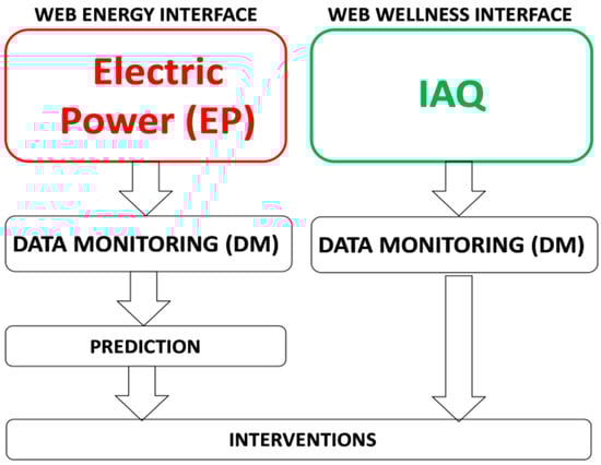 The modular implementation can simultaneously show dashboards concerning, respectively, energy monitoring and IAQ controls, stored in the same cloud platform: the methodology based on the development of the different architecture layers (as illustrated in Figure 3), integrates other sensors providing other possible information [1] (ventilation, number of persons for room, lighting, energy renewable KPI, etc.), and other dashboards (for example for noise level data [21]). Monitored and predicted energy consumption data are of primary importance to the planning of work activities in an efficient way. An example is planning efficient electrical load switching operations [22,23] according to the workers activities inside the public building, as well as load priorities [23]. The use of both energy consumption and IAQ modules allows the formulation of intervention plans (bottom level of Figure 1) based on the following procedure: