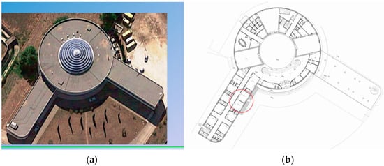 (a) Photo and (b) floor plan (right) of the building adopted for the testing of the protocol indicated in Figure 1 (Municipal building of the municipality of Nardò in the South of Italy). Experimentations were performed in the rooms indicated with the red circle.