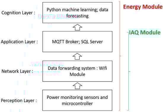 At the perception layer, sensor devices are provided which measure and acquire power process variables. At the network layer, information is sent to a cloud-based server. At the application layer, the real-time information is stored and displayed. At the cognition layer, data are post-processed while using machine learning for data analysis and forecasting for assisting in the decision making. Figure 3 highlights the architecture of the system, integrating both energy and IAQ modules: the first three layers (perception layer, network layer, and application layer) are common for both modules; the cognition (the fourth layer) only applies to the energy module and is finalized to improve the energy control by means of machine learning algorithms.