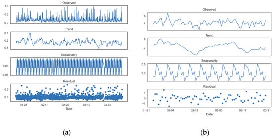 (a) Time series decomposition hourly basis. (b) Time series decomposition daily basis.