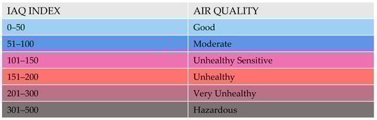 Figure 7 represents the real-time serial output of only BME sensor (see Appendix B) evaluating the indoor air quality (IAQ) parameters (VOC concentration): in Figure 7a, the real-time temperature is reported (expressed in °C) as well as relative humidity (see related description in Appendix B); in Figure 7b, the PM2.5 IAQ index versus the time (measurements of VOCs concentration) can be read. The adopted dust sensor (see Appendix B) counts the dust particles into a range between 0 to 3000 particles (PCS) per 0.01 contamination factor (CF) [19,20]. Specifically, the sensor measures the PM2.5 IAQ index versus the time. The “wellness” scale of PM2.5 level of house can be seen in ordinary ranges below 150 pc/0.01 cf. Figure 7b and Figure 8 report the IAQ “wellness” bands.